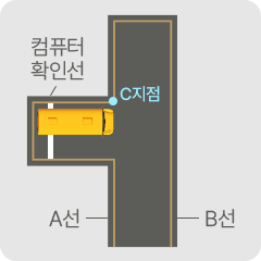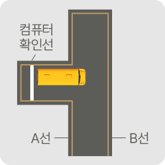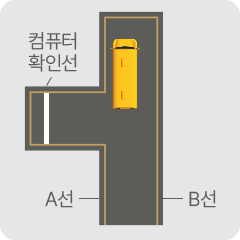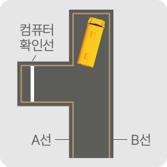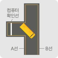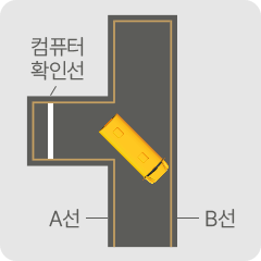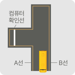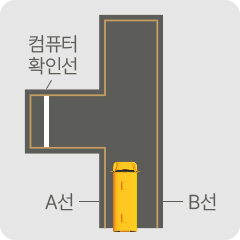자동차 왼쪽 앞바퀴가 검지선에 닫기 직전(약 10cm정도 검지선 직전에 그려진 노란선을 기준으로 해도 된다.)이 되면 차를 정지시킨다.
