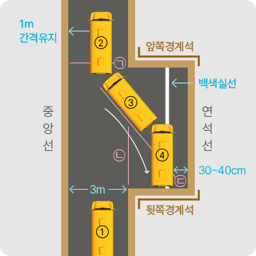 오른쪽 백미러로 보면서 차의 뒷바퀴가 앞쪽 경계석 ㉠과 일치하면 정지하고 기어를 후진으로 변속한다.